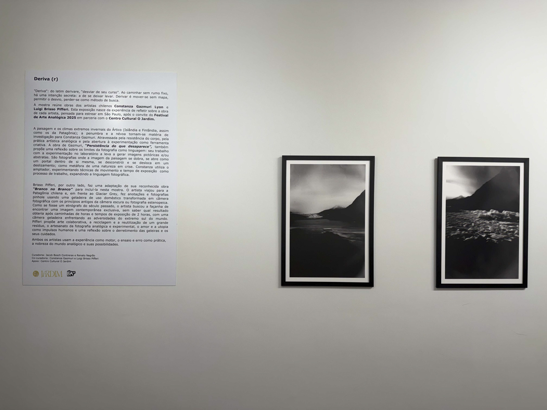 Deriva (r) – Exposição fotográfica dos chilenos: Constanza Gazmuri Lyon e Luigi Brisso Pifferi. Ambos fazem experimentações analógicas com a paisagem da Patagônia chilena. Luigi usa uma geladeira como câmera escura e Constanza utiliza o ampliador como processo de trabalho. A exposição surge da experiência de refletir sobre a obra de cada artista, pensando em um diálogo conjunto de temas com o intuito de criar um trabalho coletivo que fizesse sentido ser mostrado para o público de “O Jardim”.