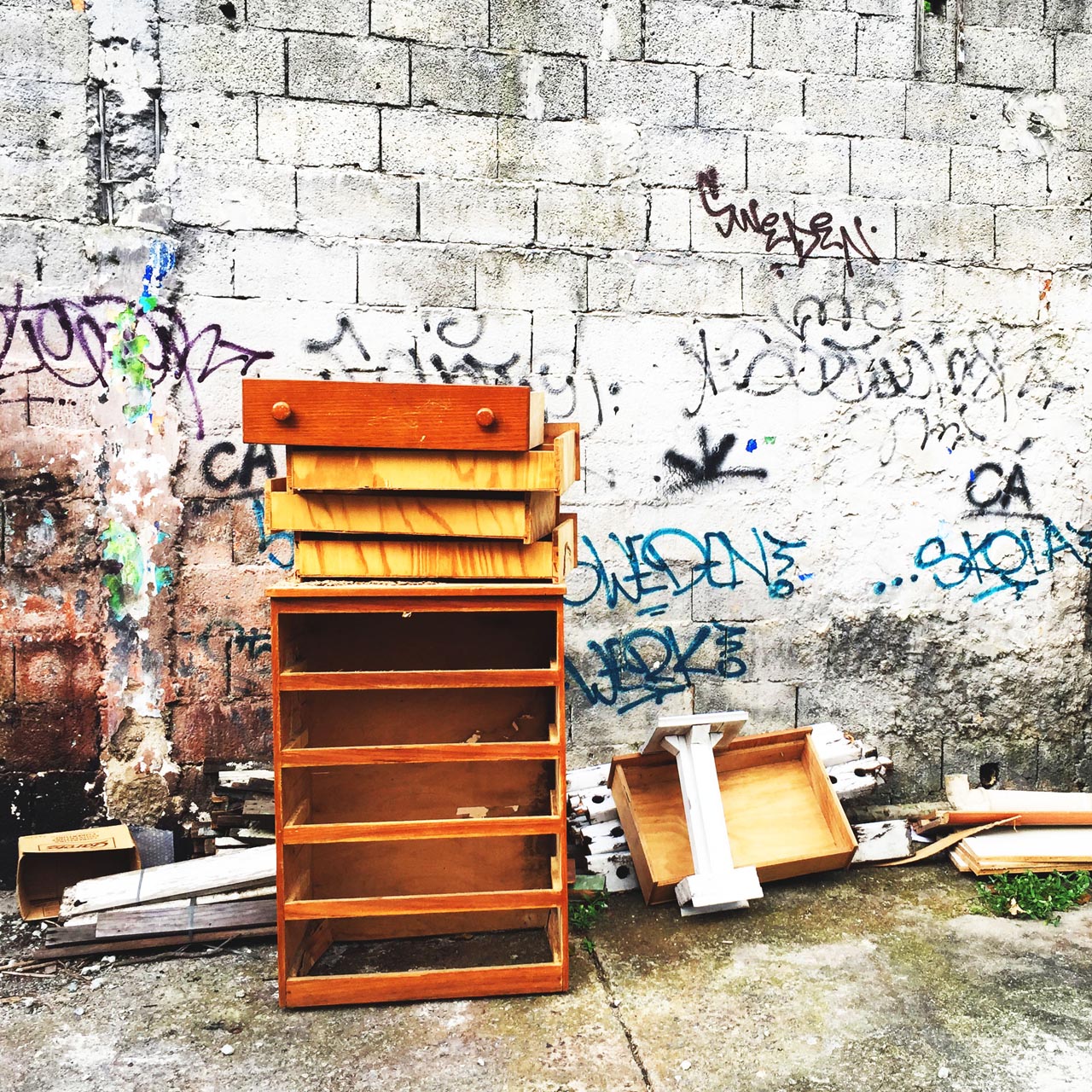 O cenário onde é construído essa narrativa visual é composto por: um muro, uma calçada e objetos domésticos deixados na rua. A partir de um enquadramento frontal, a fotógrafa passou a registrar essa paisagem e a constante transformação da cena.